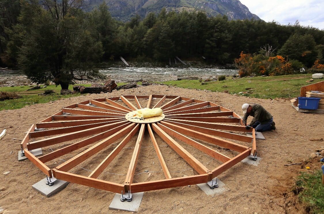 Freedom Yurt Cabins have a unique and innovative base system that we integrate into the structure. While fabric yurts require you to build an expensive and permanent foundation or deck, we designed an easy-to-assemble floor system of a Freedom Yurt Cabin that you can completely remove. Joists radiate outward from a steel center support ring. Adjustable feet make leveling quick and easy. Floor sheathing panels are precision cut and have integrated spacing nubs assuring the correct spacing between the sheathing panels. Sheathing is screwed directly to the joists. Sheathing screw locations are pre-drilled and counter-sunk for ease of installation (no guesswork). Access underneath the floor by removing individual sheathing panels or drilling straight through them to route plumbing and electricity, making yurt platform construction quick and easy. We understand that you want to build your new yurt cabin quickly. The sooner it’s built, the sooner you can enjoy this luxurious yet cozy structure.