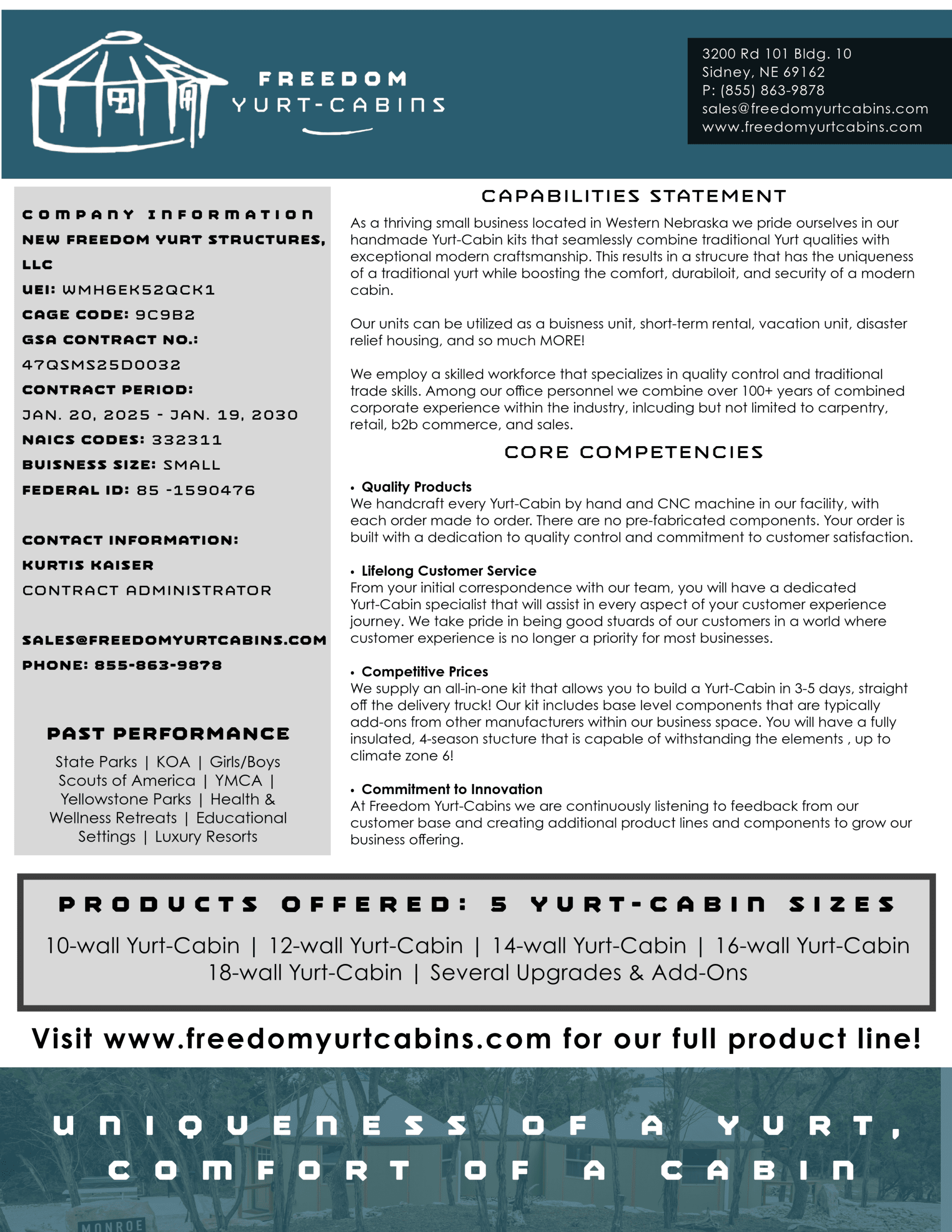 Freedom Yurt-Cabins provide an efficient and streamlined purchasing process for local, state, and federal agencies. With our commitment to supporting government operations, we offer durable, easy-to-assemble Yurt-Cabins that meet the specific needs of various governmental sectors. Whether you’re looking for temporary housing, office space, or emergency response solutions, Freedom Yurt-Cabins are designed to deliver fast, reliable, and cost-effective solutions. We are ready to serve all levels of government with top-quality, prefabricated structures that enhance efficiency and sustainability.